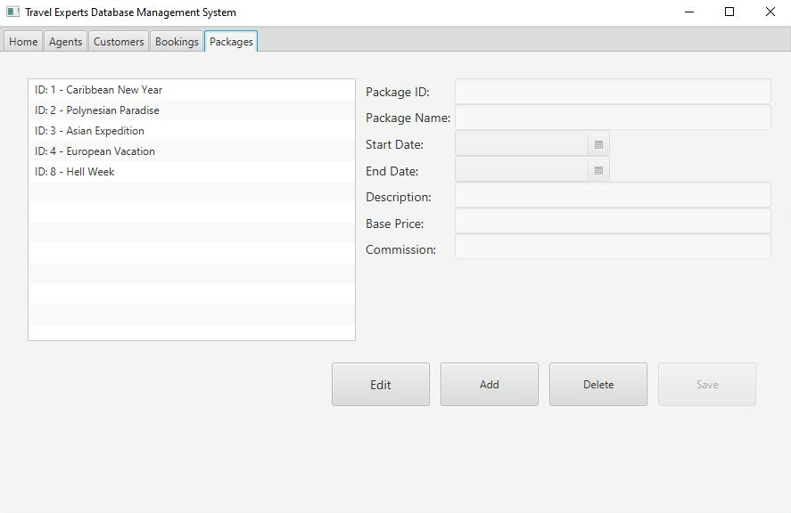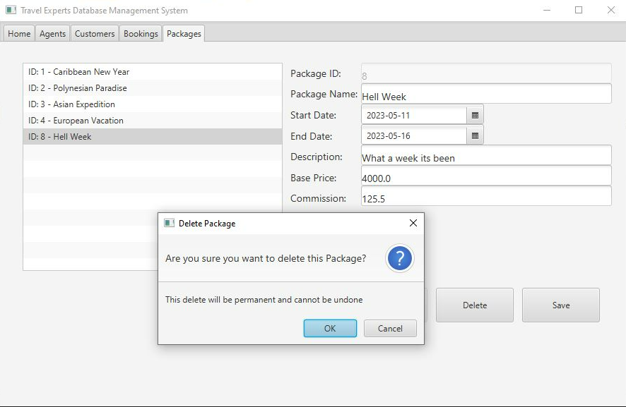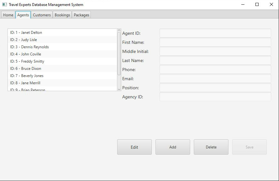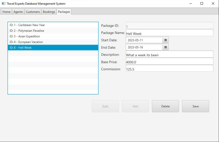 An Desktop app that access a Database of Agents, their clients, their clients bookings and the Companies available Packages. Agents can log into the app and make edits, deletions and create new entries in any of the categories listed above; these changes will reflect in the database and not just the application.